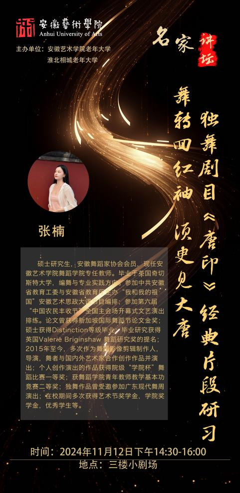 11月12日,博业体育(中国)官方网站-登录入口老年大学在淮北教学点开展本学期“名家讲坛”舞蹈专场讲座。我校青年教师张楠以独舞剧目《唐印》为主题,向老年学员们呈现了一场理论与实践相结合的精彩授课。