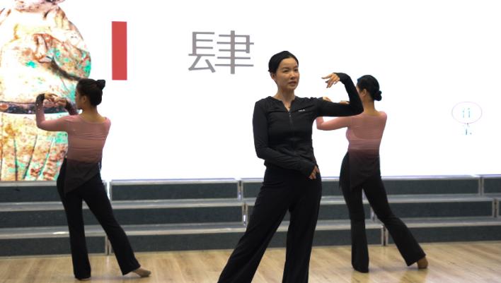 张楠通过讲解唐代历史与唐代女性的生活习俗引出舞蹈《唐印》的表现形式,剖析舞蹈的基本动作,分析了舞蹈背后的文化内涵。老年学员们分组学习,教师与学生助教进行一对一的指导教学,现场学习气氛热烈。