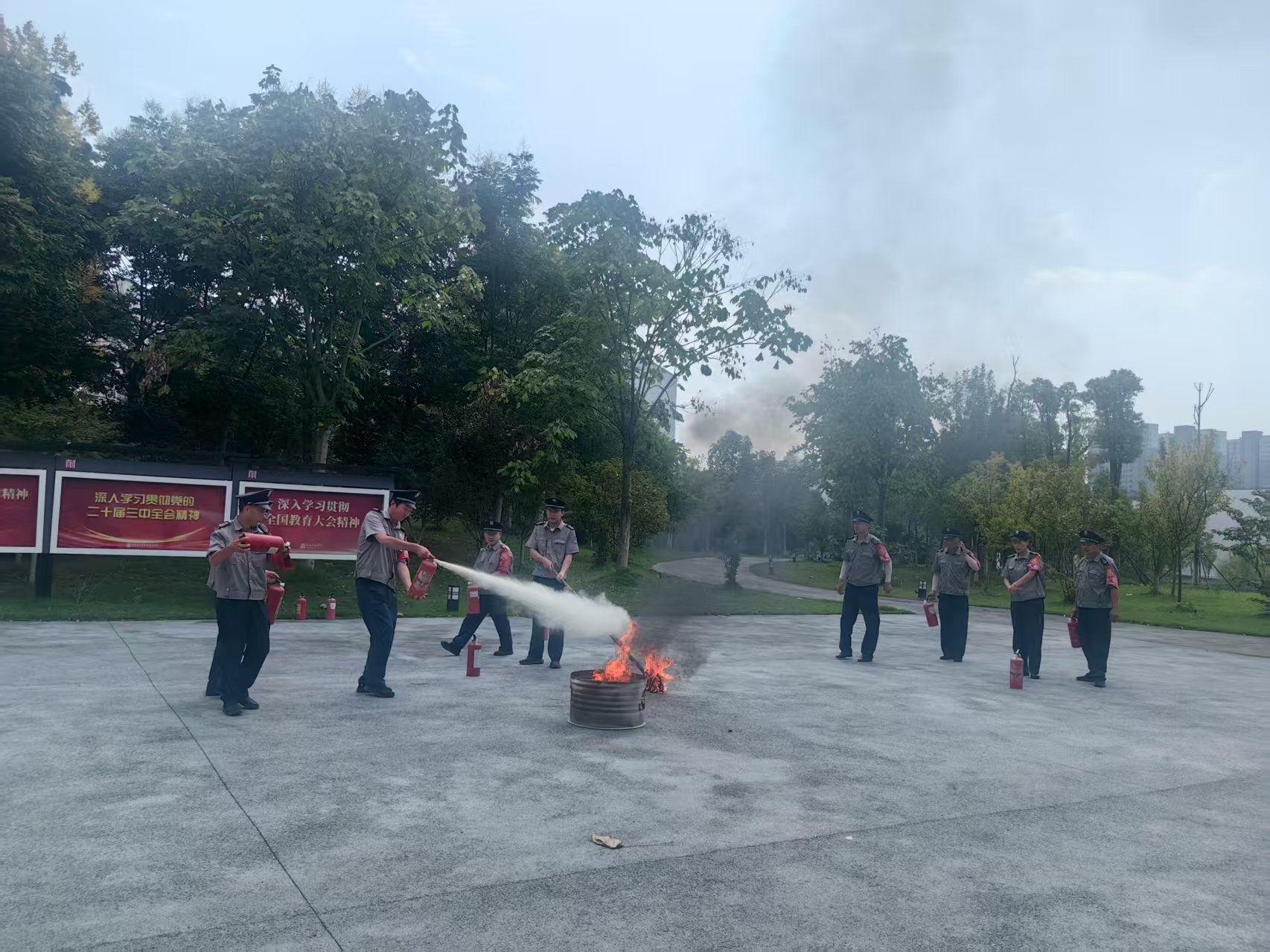 培训结束后,为了检验培训效果,参加培训人员在崇德楼前广场进行消防实操演练。校保安队队长给大家详细讲解和演示灭火器使用方法后,现场人员依次进行实践操作,确保真正掌握灭火器的使用方法。