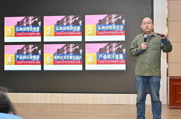 在主题讲座中,张剑教授聚焦“设计方法与课题实践”这一主题,系统介绍了个人及工作室成果。讲座围绕其教学理念与设计方法展开,以“认知-经验-符号”为核心框架,融入结构主义与叙事设计思维,针对不同学段提出分层培养目标;同时强调“设计即设置”的创作逻辑,主张通过隐藏功能让使用者自主发掘体验乐趣,摒弃“元素堆积”与“伪命题”式设计。在方法层面,他提倡回归生活细节与实物接触,挖掘五感体验与行为逻辑,善用废弃材料、资源,并结合修辞与伴随文本增强表达,同时鼓励通过设计赛事积累实战经验。