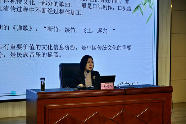 安徽民歌是徽文化的重要载体,蕴含着丰富的地域文化基因与人文精神。田雅丽教授结合研究团队长期田野调查获取的第一手资料,深入讲解了五河民歌、凤阳民歌、徽州民歌、大别山民歌等安徽代表性民歌的音乐特点,并结合自身科研与教学实践,剖析安徽民歌的艺术价值,系统阐述传承与保护的思考。