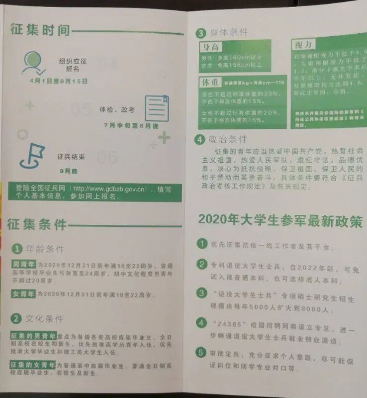 受疫情影响,今年上半年征兵工作推迟,与下半年一并组织实施。男兵应征报名时间为4月1号到8月15号,女兵应征报名时间为6月26号到8月15号。为鼓励大学生应征入伍,征兵时,大学生可享受优先报名应征、优先体检政审、优先审批定兵、优先分配去向四项优先政策。同时,在校生服役期间按国家有关规定保留学籍或入学资格,退役后两年内允许复学或入学。本专科学生每人每年可获得不超过8000元的学费资助,研究生每人每年不超过12000元。