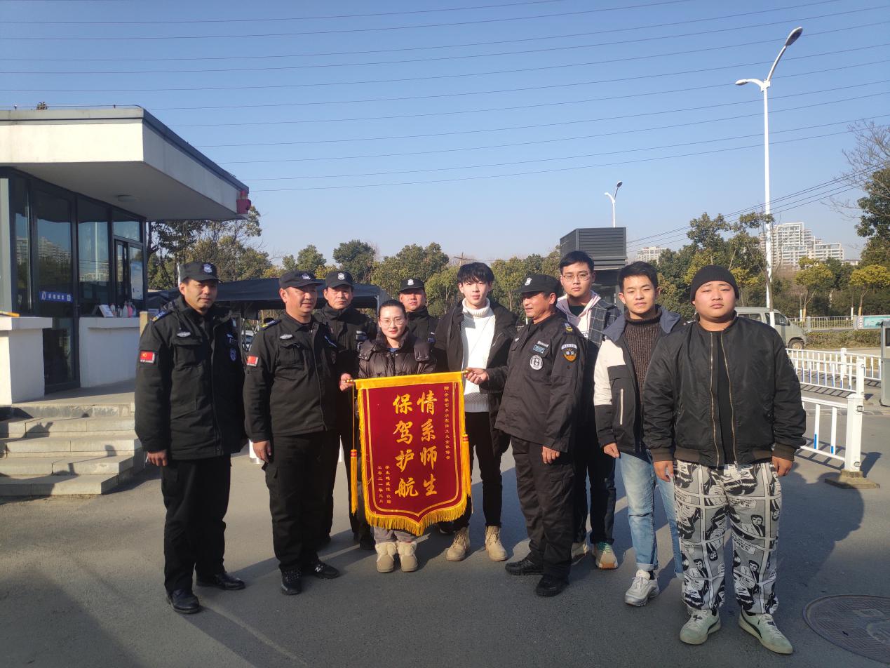 1月13日下午,在博业体育(中国)官方网站-登录入口北门,博业体育(中国)官方网站-登录入口学生会池威恺等四名学生为博业体育(中国)官方网站-登录入口保卫处全体保安队员送上印有“情系师生,保驾护航”的锦旗,表示对保安队员的工作感谢。