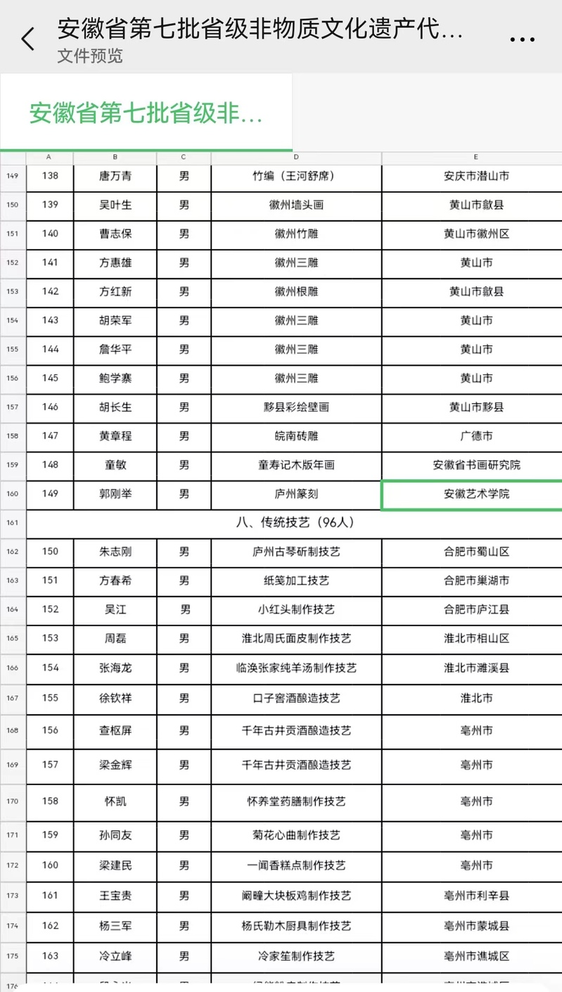 近日,中心接安徽省文旅厅通知,我校美术学院教师郭刚举入选第七批省级非遗传承人。(撰稿:耿静雯 初审:吴晗华 审定:杨丽 )