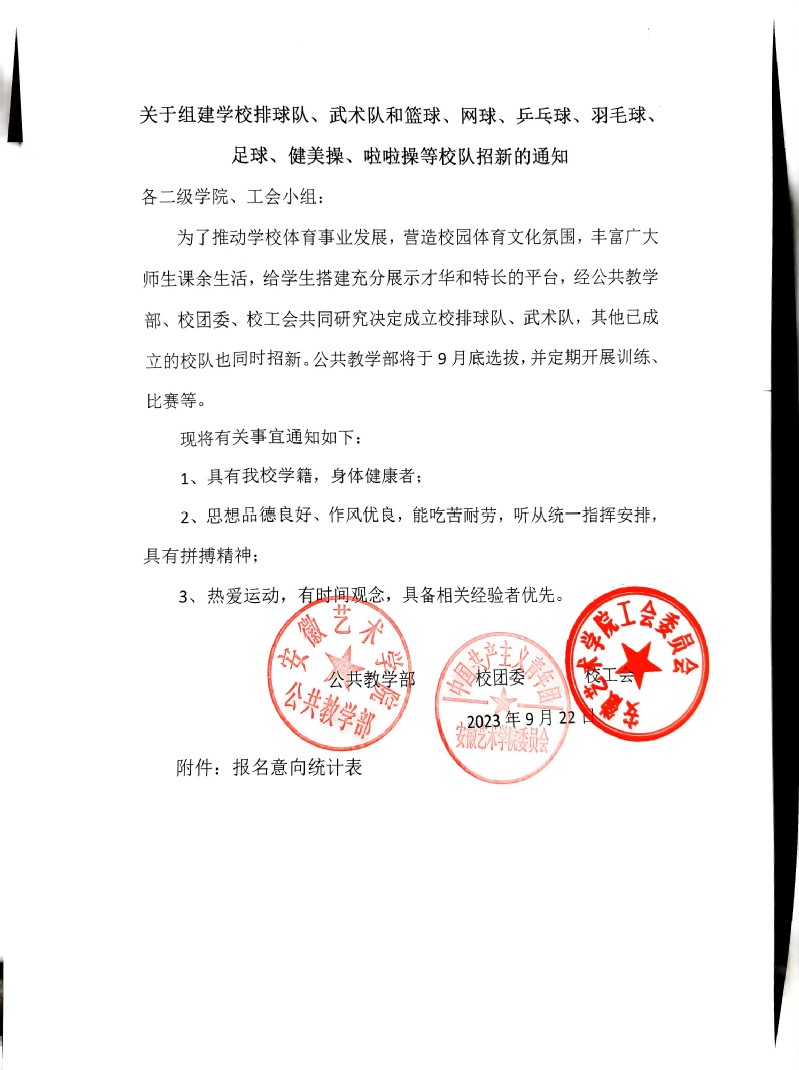 关于组建学校排球队、武术队和篮球、网球、乒乓球、羽毛球、足球、健美操、啦啦操等校队招新的通知