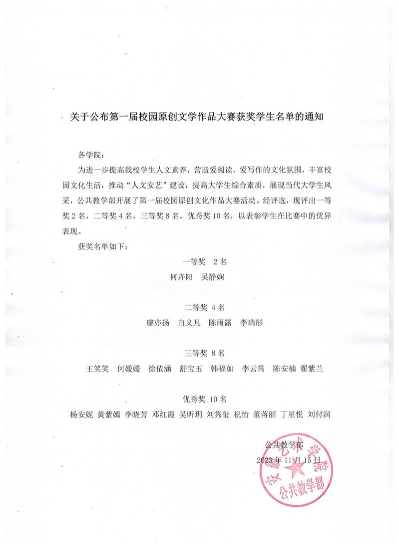 关于公布第一届校园原创文学作品大赛获奖学生名单的通知