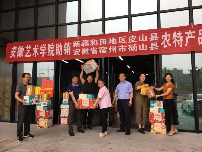 6月22日,学校助销新疆和田地区皮山县和宿州市砀山县的农特产品发放活动举行。校党委委员、行政负责人张晶,校工会负责人吴孔铎、王琍琍、王立仁等工会同志到发放现场,为全校教职工发放慰问品,并祝老师们端午节日安康。