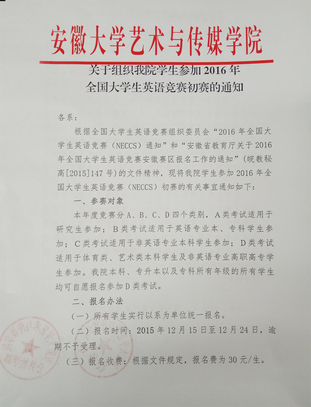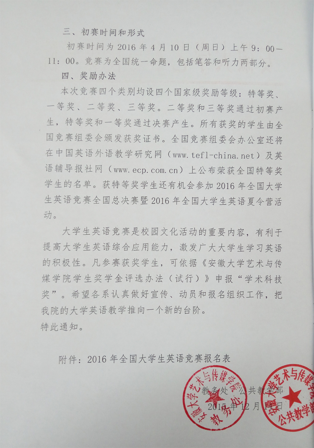 关于组织我院学生参加2016年全国大学生英语竞赛初赛的通知