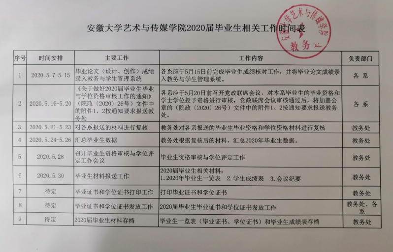 安徽大学艺术与传媒学院2020届毕业生相关工作时间表