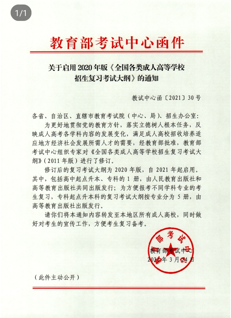 关于启用2020年版《全国各类成人高等学校招生复习考试大纲》的通知