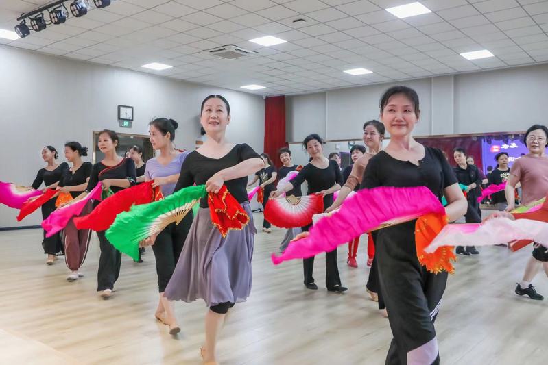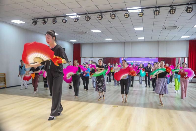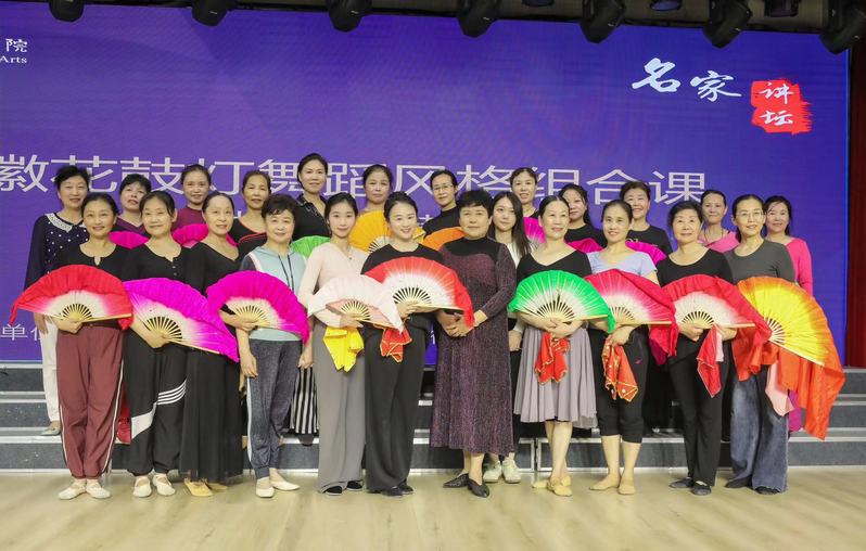 吴老师采取现场教授舞蹈的形式授课。在场的学员们和着花鼓铿锵的节奏,左手拿巾,右手执扇,在老师指导下翩然起舞,上了一堂生动的舞蹈艺术课。