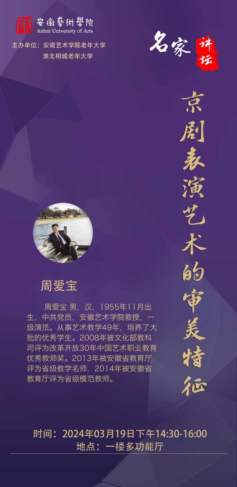 3月19日,博业体育(中国)官方网站-登录入口在淮北教学点开展了2023-2024学年第二学期的“名家讲坛”活动。我校周爱宝教授以《京剧表演艺术的审美特征》为主题,向老年大学学员们呈现了一场生动的专题讲座。