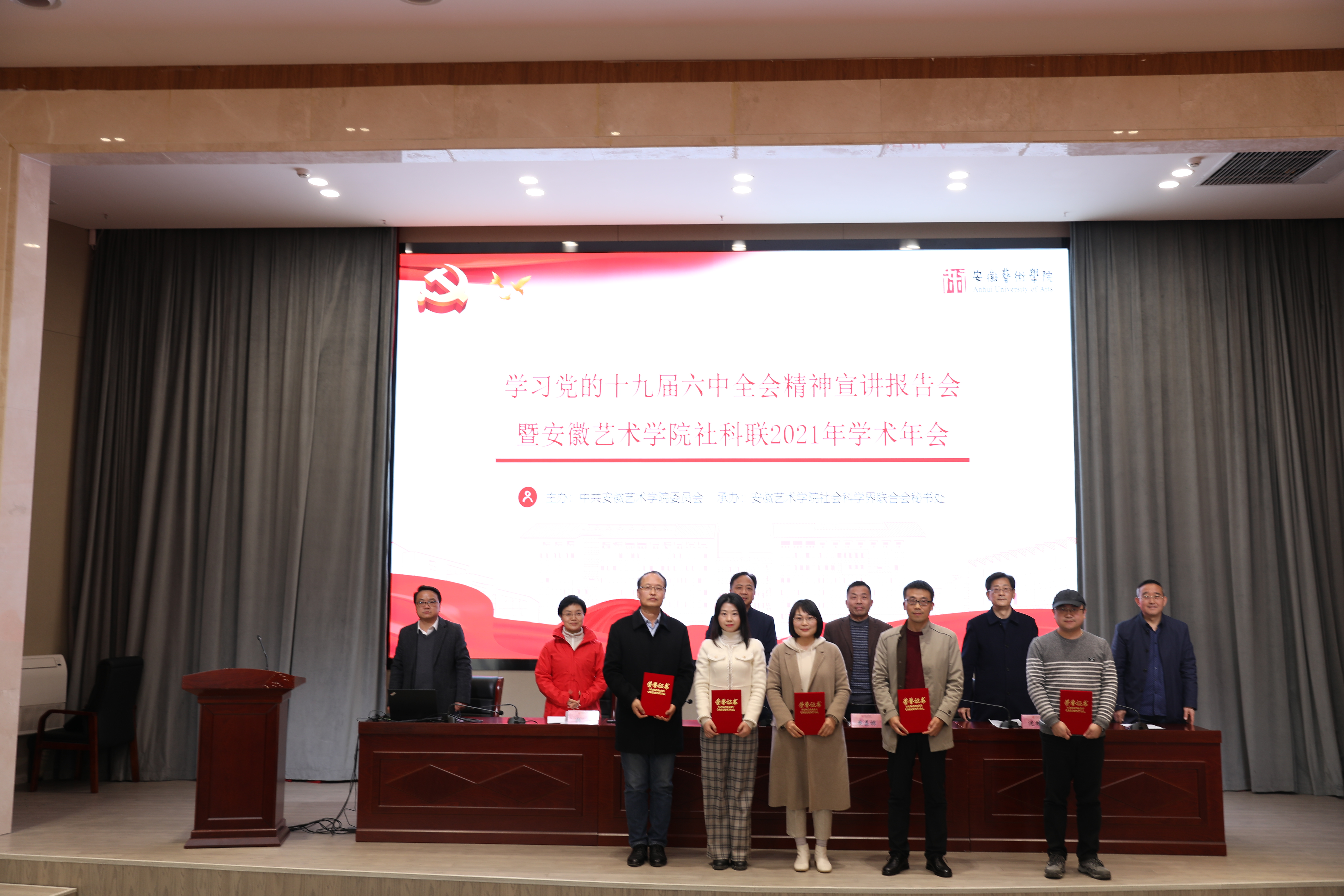 会上,发展规划与科研处处长陈明海宣读《关于校社会科学界联合会2021年学术年会主题征文获奖情况的通报》。其中,新闻播音系戚庆燕撰写的《新媒体语境下正能量新闻报道的破困之思——运用马克思主义新闻观聚人心凝共识》等2篇论文获一等奖,音乐舞蹈系潘捷撰写的《<中国民间歌曲集成·安徽卷>中革命题材类民歌述论》等4篇论文获二等奖,美术设计系王力平撰写的《安徽地方戏的生存境遇与创新发展探析》等8篇论文获三等奖。