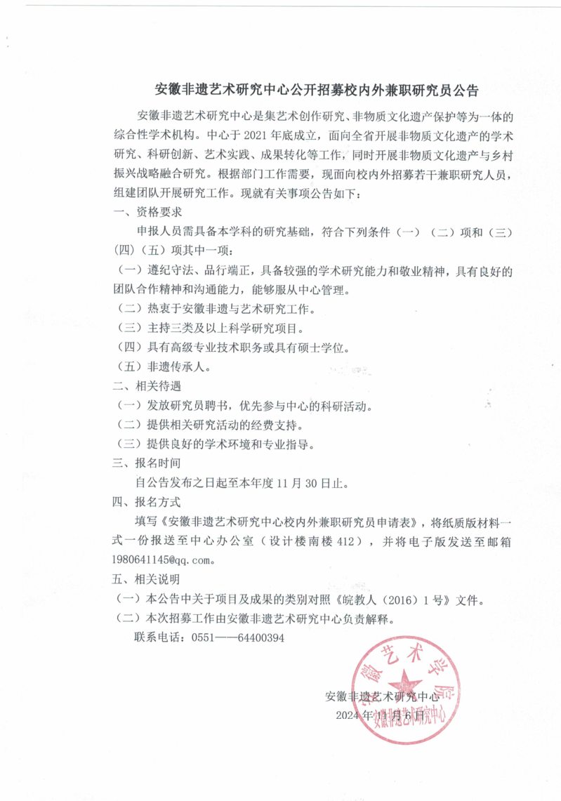 安徽非遗艺术研究中心公开招募校内外兼职研究员公告