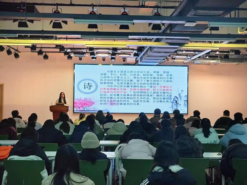 12月11日下午,“徽文化”系列讲座第二讲开讲,公共教学部陈颍做了题为“古诗词里的安徽”的讲座。本次讲座有100多名在校同学参加。