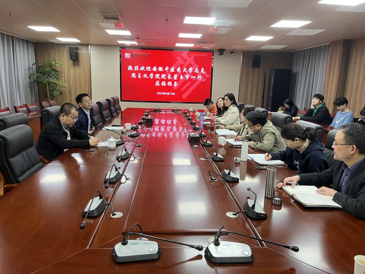 4月15日上午,安徽中医药大学马克思主义学院院长董玉节、副院长郭跃来我校指导工作。校发展规划与科研处处长陈明海、马克思主义学院全体教师参加会议,会议由马克思主义学院副院长陈昀岚主持。