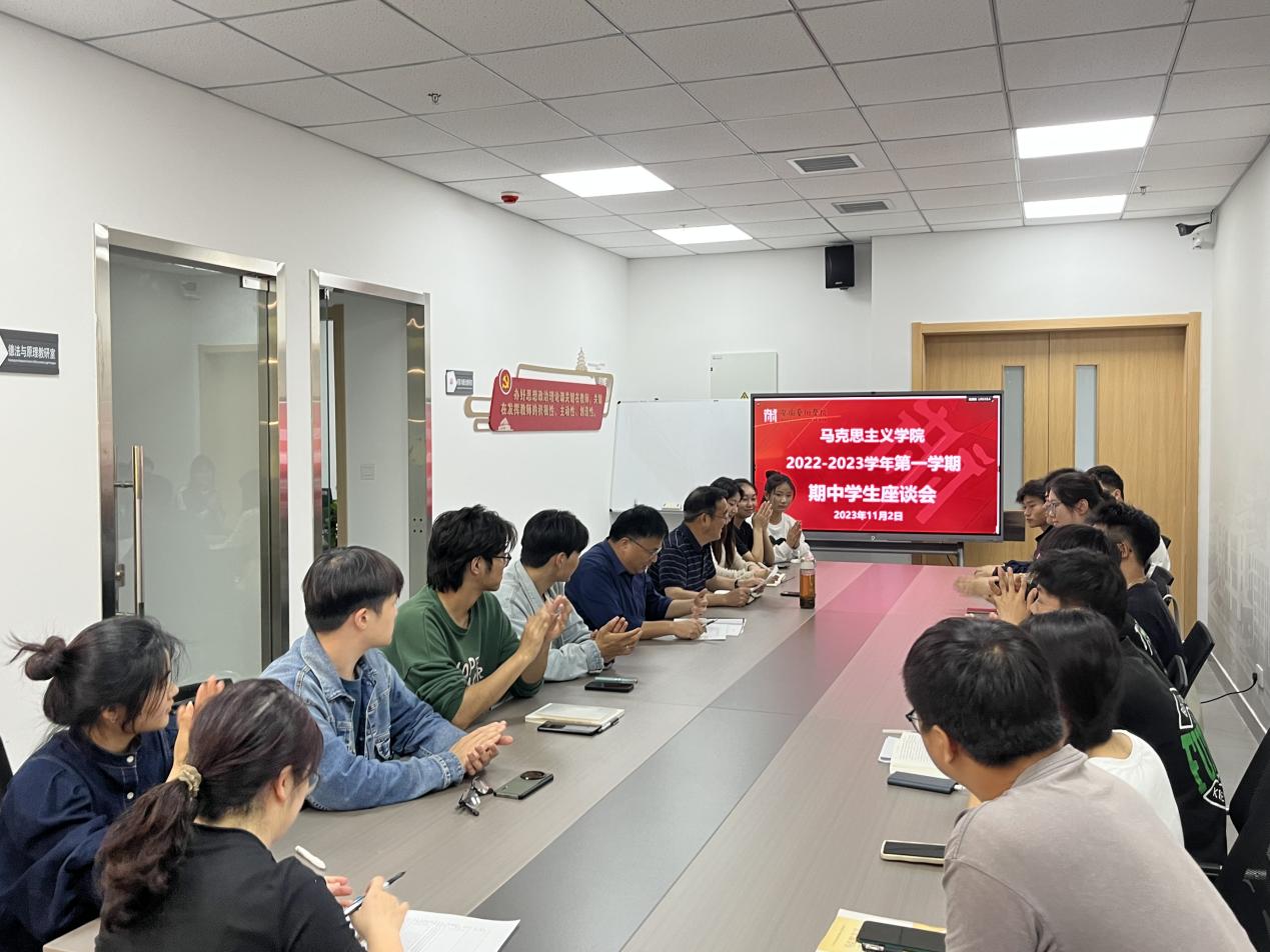 11月2日、3日中午,马克思主义学院在综合楼721召开2023-2024学年第一学期期中学生座谈会。近50名2022级、2023级本科生代表参加会议。会议分别由纲要与概论教研室主任朱哲恒、德法与原理教研室主任杨婷婷主持。马克思主义学院院长吴孔铎、副院长陈昀岚参加会议。