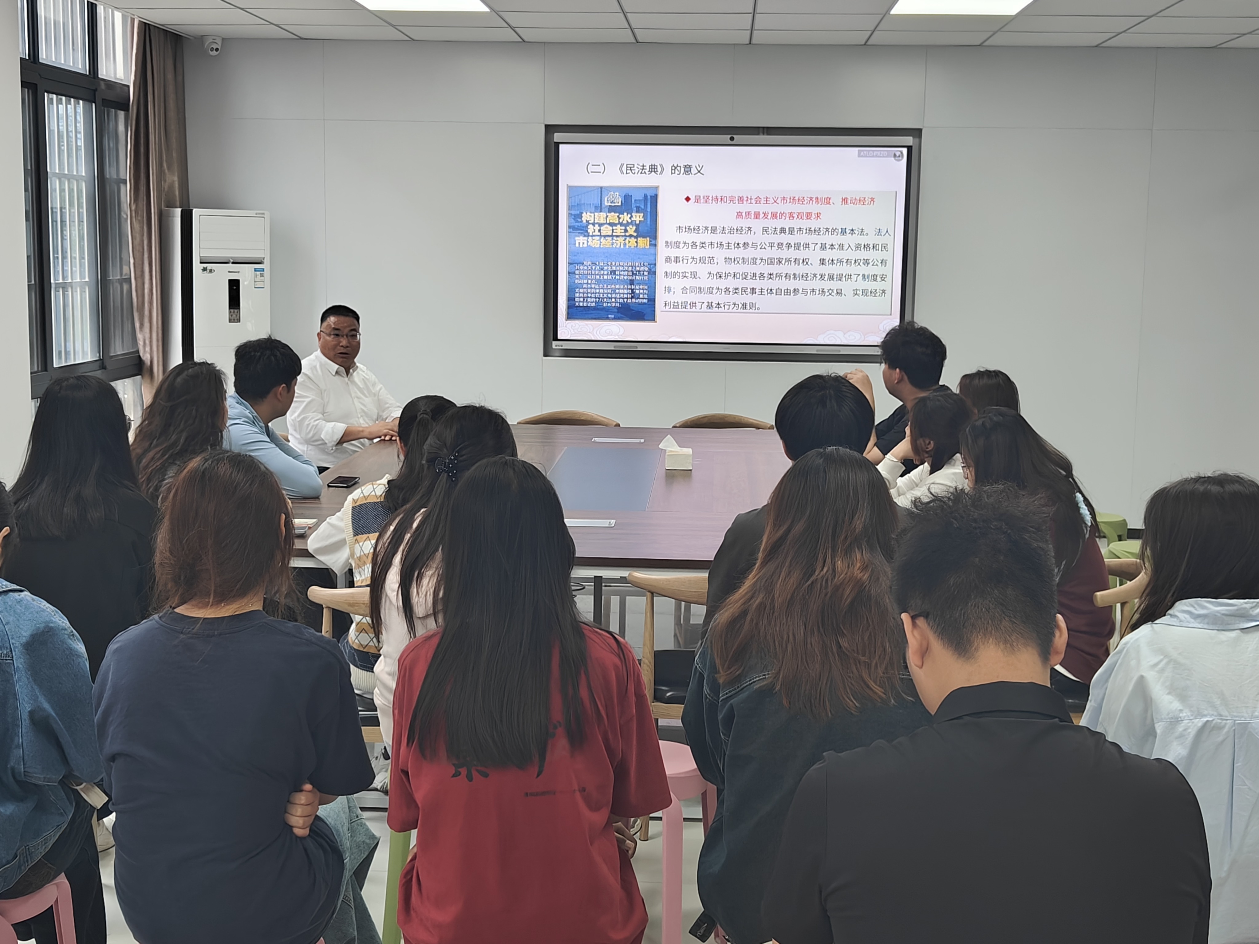 为深入贯彻落实中央八项规定精神,切实推动思政教育与学生需求紧密结合,提升服务青年学生的能力与实效,5月23日下午,马克思主义学院选派资深教师朱哲恒博士走进一站式学生社区,开展了以《“典”靓生活——民法典与大学生活》为题的专题讲座,为同学们带来了一场别开生面的法治文化盛宴。各二级学院思政委员、退役士兵、校长助理等参与活动。