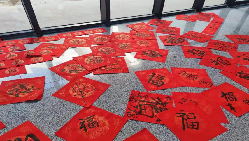 同学们带着新年的祝福挥毫泼墨,笔走龙蛇,全神贯注书写着春联,个个忙得不亦乐乎。把一幅幅体现着“欢乐和谐”、“平安祥和”等主题的春联无偿送到师生手中。会场里的每个人都有条不紊地做着相关工作,整个会场都被喜庆的红色渲染了。