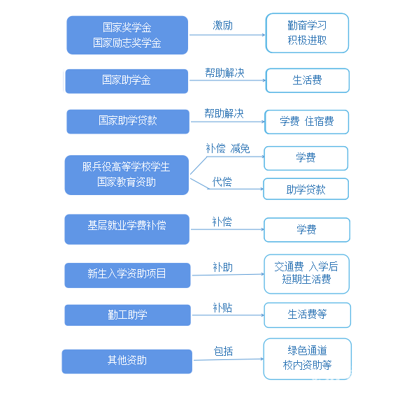我省在高等教育本专科阶段建立起国家奖学金、国家励志奖学金、国家助学金、国家助学贷款等多种形式有机结合的高校学生资助政策体系。(如遇国家、省政策调整,以新政策文件为准执行)