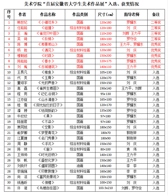 4月15日,从安徽省美术家协会官方公众号获悉,由安徽省文联、安徽省美协主办的“首届安徽省大学生美术作品展”公布了评选结果。经专家组评审,博业体育(中国)官方网站-登录入口美术学院共31名学生通过复评,其中获二等奖1人、三等奖3人、优秀奖5人。本届展览共收到4022件作品,包含绘画类和设计类作品,最终入选363件,。入选作品将于2023年4月16日—4月26日在合肥市中环艺术馆A馆展出。