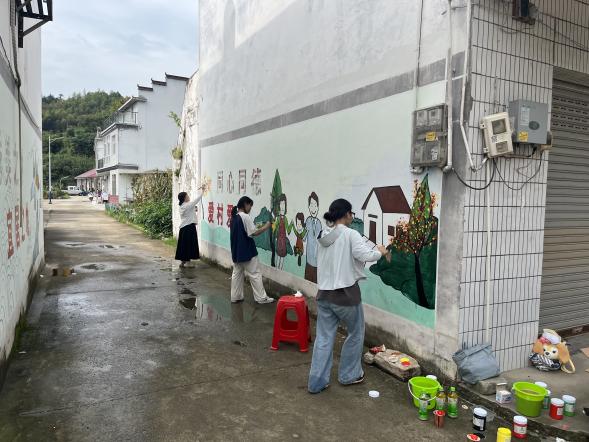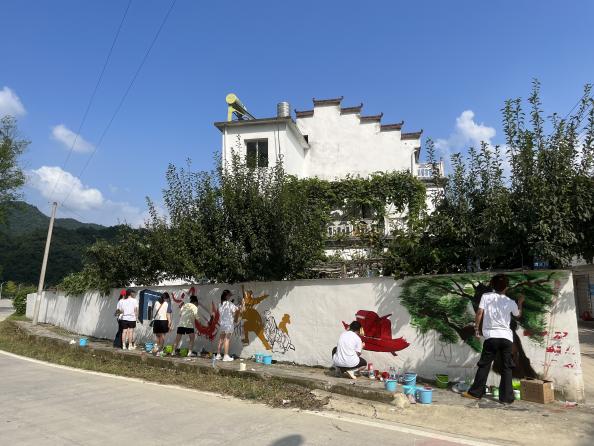 师生对汤店村进行实地考察调研之后,结合当地实际情况,创作了墙绘壁画,烈日下师生们挥毫泼墨,构图、起形、调色、绘制,经过一番努力,原本平平无奇的白墙仿佛披上七彩新衣,画面也展现汤店村精神面貌。