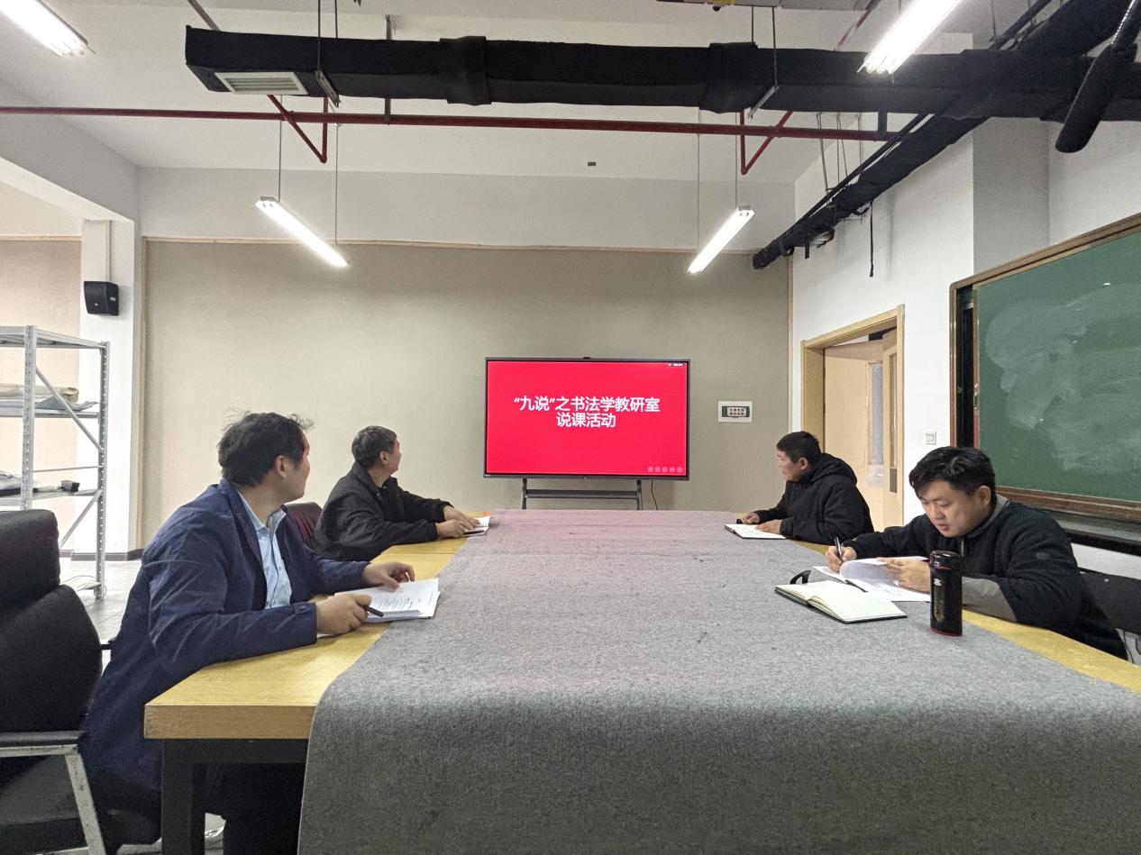 12月3日中午,在美术楼411书法学教研室,开展了“九说”系列活动之说课活动。书法学专业教师张典友、郭纲举、刘永亮、汤传盛分别进行说课,老师们使用PPT课件进行说课,分别讲说了课程概述、教学设计、教学环境、教学工具、教学方法、教学效果、创新特色等方面。老师们互相评说,互相交流,扬长补短,增进了了解,达到了共同提高的目的。