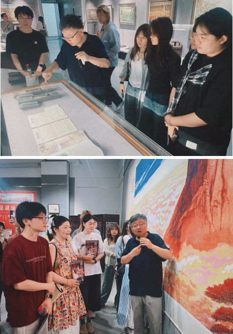 师晶先生一直致力于推动新徽派版画艺术在高校教学实践中的传承与发展。在展览现场,师晶先生热情地为师生们讲解自己创作的心路历程,毫无保留地分享他对新徽派版画刀法运用、精妙构图以及深远意境的深刻理解与独特感悟。以古鉴今,让文化遗产成为滋养创新的土壤;以艺载道,使青年创作者在触摸传统时,听见时代的召唤。最后师晶先生语重心长地寄语青年艺术创作者:“你们要主动承担起新时代艺术青年的创作使命,接过新徽派版画传承与创新的接力棒,以更多、更丰富的优秀作品来展现我们的美丽中国,美好安徽!”