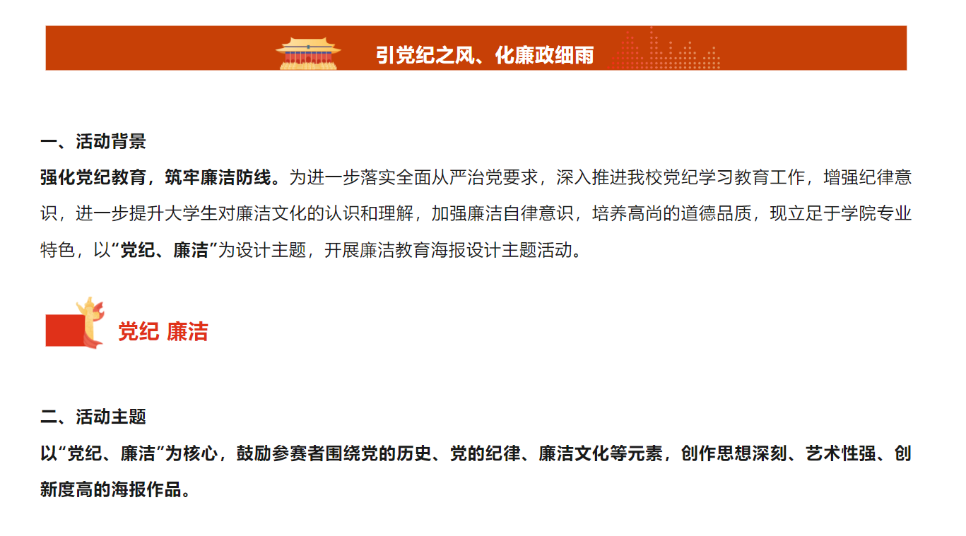 强化党纪教育,筑牢廉洁防线。为进一步落实全面从严治党要求,深入推进我校党纪学习教育工作,增强纪律意识,进一步提升大学生对廉洁文化的认识和理解,加强廉洁自律意识,培养高尚的道德品质,现立足于学院专业特色,以“党纪、廉洁”为设计主题,开展廉洁教育海报设计主题活动。