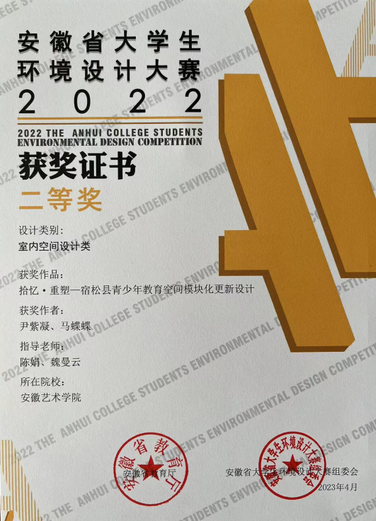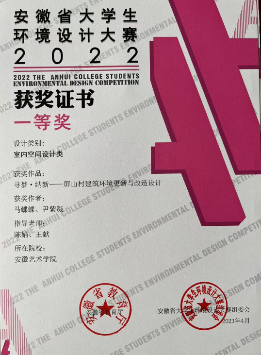 近日,由安徽省教育厅主办,安徽工程大学承办的2022年安徽省大学生环境设计大展公布获奖情况。我院陈娟、王献、魏曼云等教师所指导的学生斩获佳绩。其中马蝶蝶、尹紫凝等同学取得了包括一、二等奖在内的奖项。大赛主委会授予陈娟、王献为优秀指导教师称号。