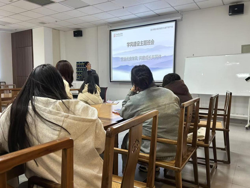 3月11日晚,设计学院24级非物质文化遗产保护专业两个班级分别在学院208和407教室成功举办了以“营造优良学风,共建成长共同体”为主题的班会活动。此次班会旨在深入分析当前学风现状,探讨如何通过加强校园文明礼仪、课堂纪律以及晚自习管理,共同营造一个积极向上的学习氛围。班会由辅导员吴又进主持。