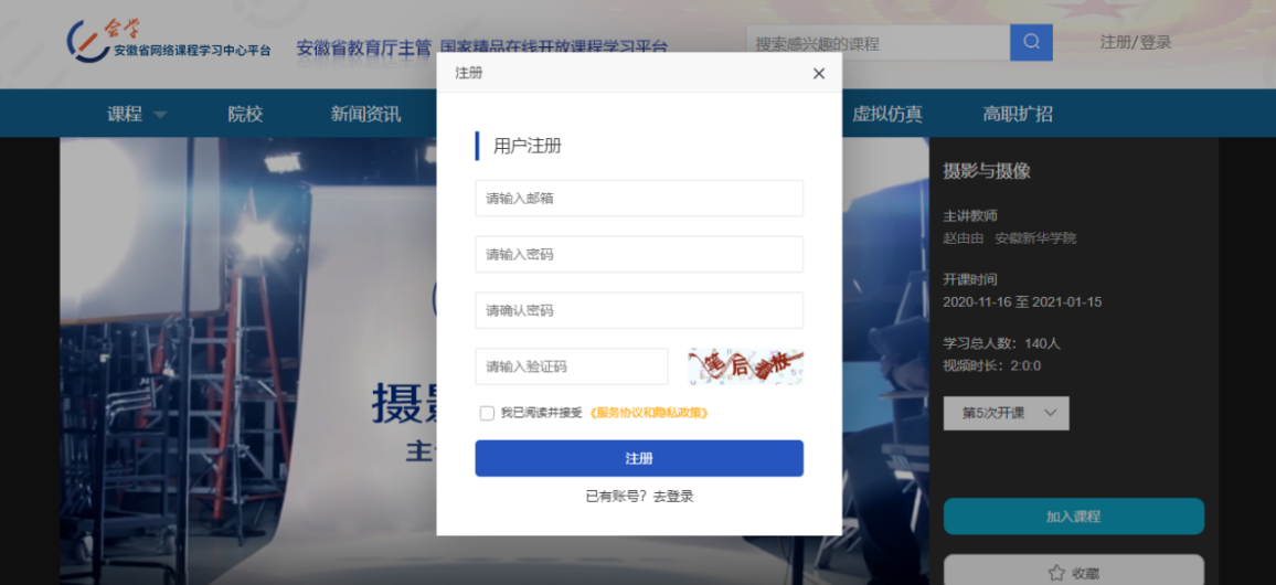 需要注意的是,所有课程都必须要先登录才能播放。如果是第一次使用,必须先完成注册。个人手机号及邮箱均可进行注册。选择任一课程,点击“加入课程”按照提示完成操作或者直接点击页面右上方的“注册”即可。