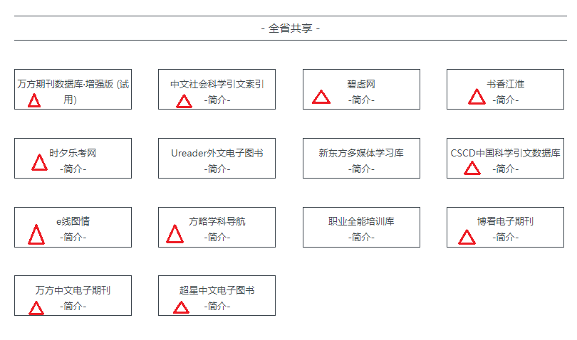 点击“团购资源”模块“全省共享”栏目可检索使用一批全省高校共享的数据库。