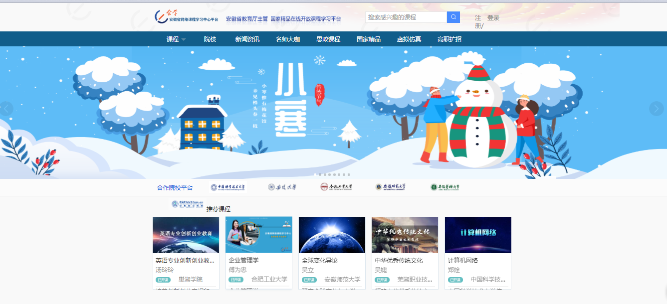 点击“安徽省网络课程学习中心”版块可收看计算机、经济管理、艺术设计、工学、医学健康、文学等方面的线上课程。