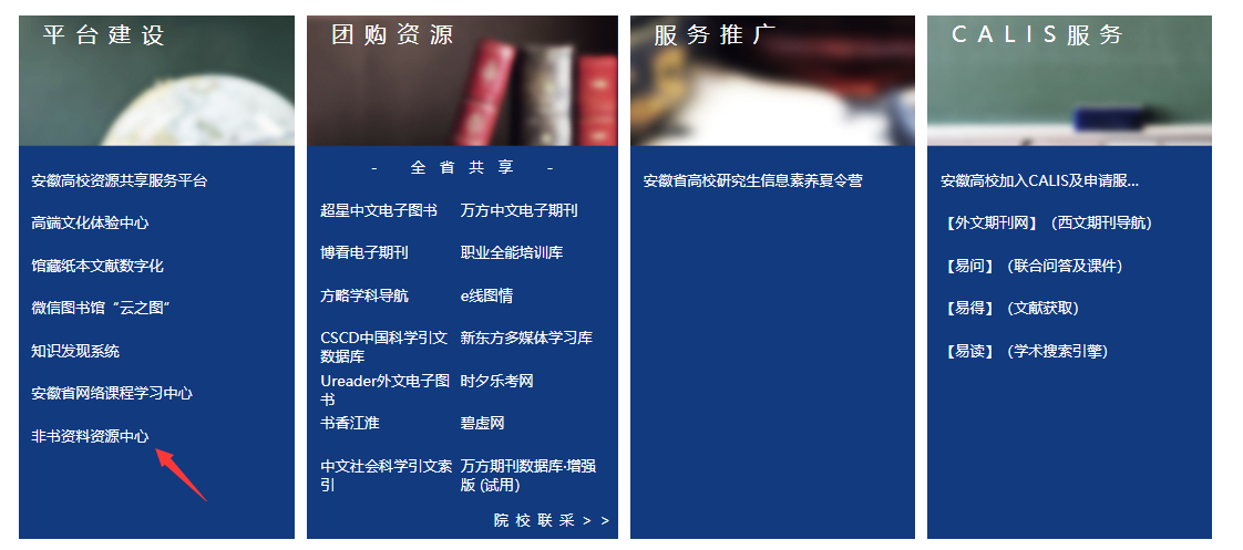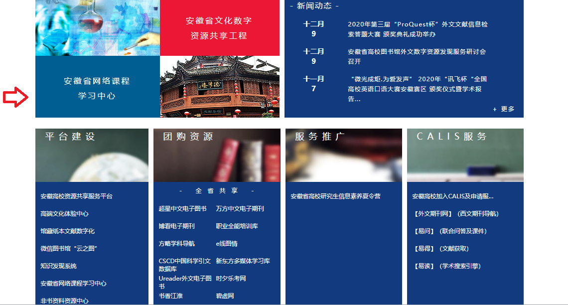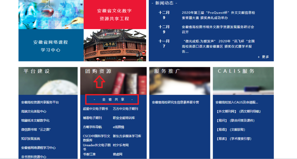目前,我院已正式开通使用,广大师生可利用该平台获得大量的文献信息服务,包括:检索一批安徽省各高校共享的优质的电子资源数据库;可免费获得其它高校图书馆的电子资源原文传递服务;还能使用到大量安徽省建设的优质课程资源等。
