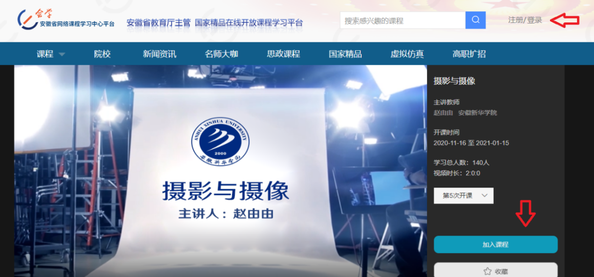 需要注意的是,所有课程都必须要先登录才能播放。如果是第一次使用,必须先完成注册。个人手机号及邮箱均可进行注册。选择任一课程,点击“加入课程”按照提示完成操作或者直接点击页面右上方的“注册”即可。