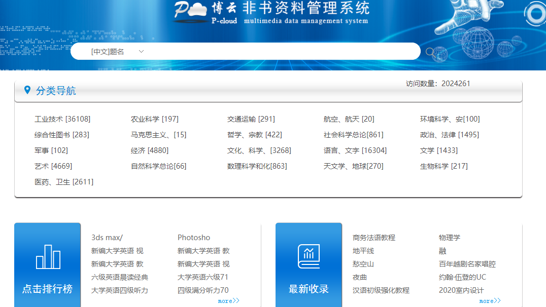 点击“平台建设”子栏目,选择“非书资料资源中心”,可以查到并使用艺术、文化、科学等21个大类的图书所配套的随书光盘。