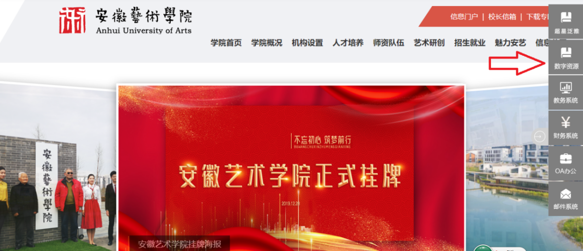 1、打开学院官方网站,点击页面右边状态栏的“数字资源”版块即可跳转。