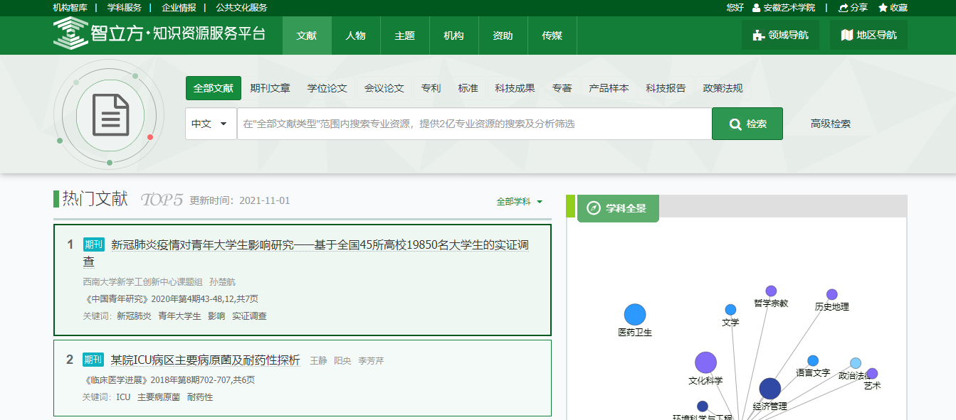 “智立方知识资源服务平台”收录了中文期刊文献6467余万篇、中文会议文献237余万篇、中文学位论文文献361余万篇、中文图书文献347余万篇、中文科技成果文献89余万篇、中文标准文献53余万篇、外文文献7916余万篇等。