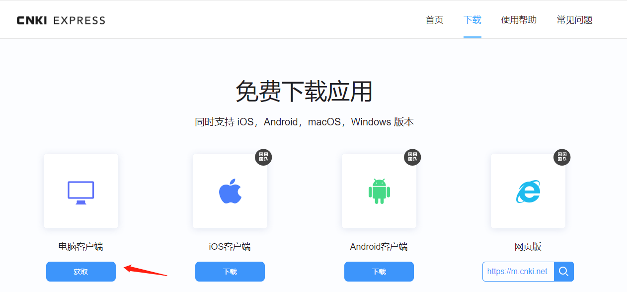 2、pc端:首先,在学校ip范围内下载安装手机app“全球学术快报”并注册登录后,在电脑浏览器中输入网址https://m.cnki.net/mcnkidown/index.html,点击网页上方的“下载”选项。