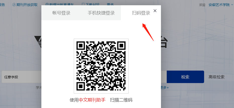 选择“扫码登录”,打开维普app“中文期刊助手”扫描二维码即可。账号有效期为180天左右,到期需在学校ip范围内重新关联绑定。