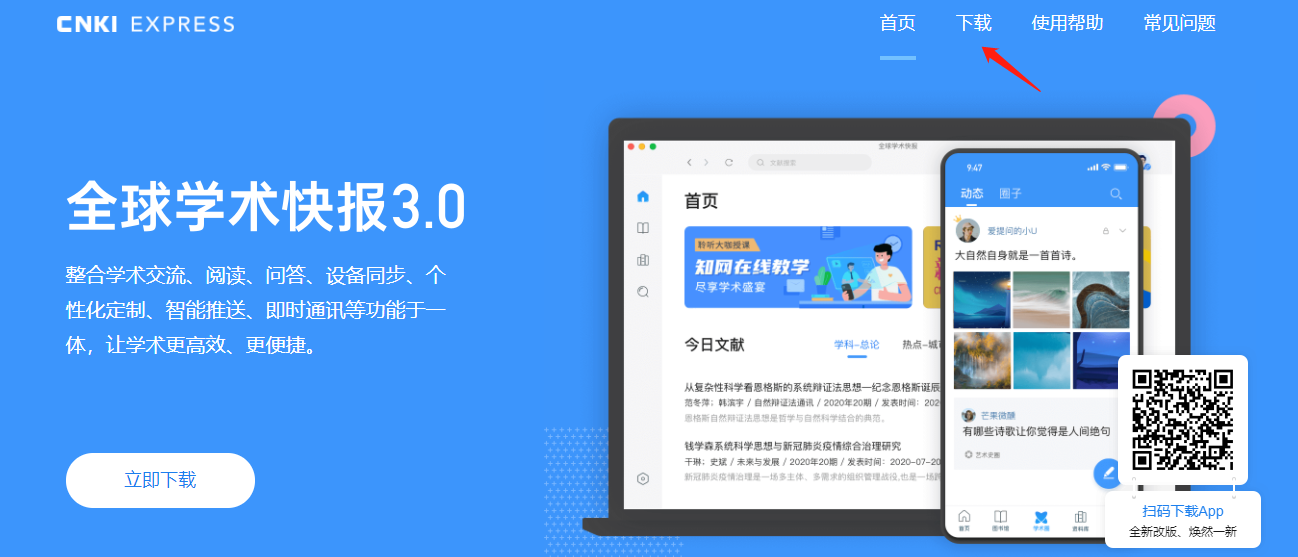 2、pc端:首先,在学校ip范围内下载安装手机app“全球学术快报”并注册登录后,在电脑浏览器中输入网址https://m.cnki.net/mcnkidown/index.html,点击网页上方的“下载”选项。