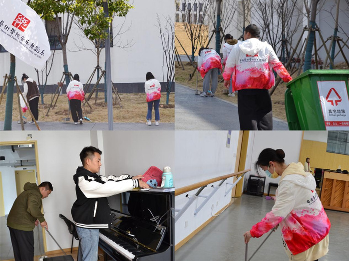 同学们学雷锋、见行动,手持扫帚、拖把等清洁工具,在舞蹈教室和琴房等教学场地及楼宇公共空间清扫灰尘垃圾,细心擦拭桌椅及教学器材,将物品摆放整齐,以身体力行的实际行动弘扬社会主义核心价值观,参与学校文明创建。