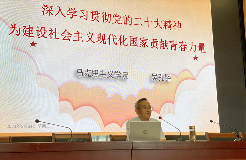 吴孔铎以《深入学习贯彻党的二十大精神,为建设社会主义现代化国家贡献青春力量》为题,讲述党的二十大的重要成果及重大意义,并从“五个牢牢把握”“四个面对”“六个深刻领会”等方面对党的二十大报告进行了深入分析和解读。