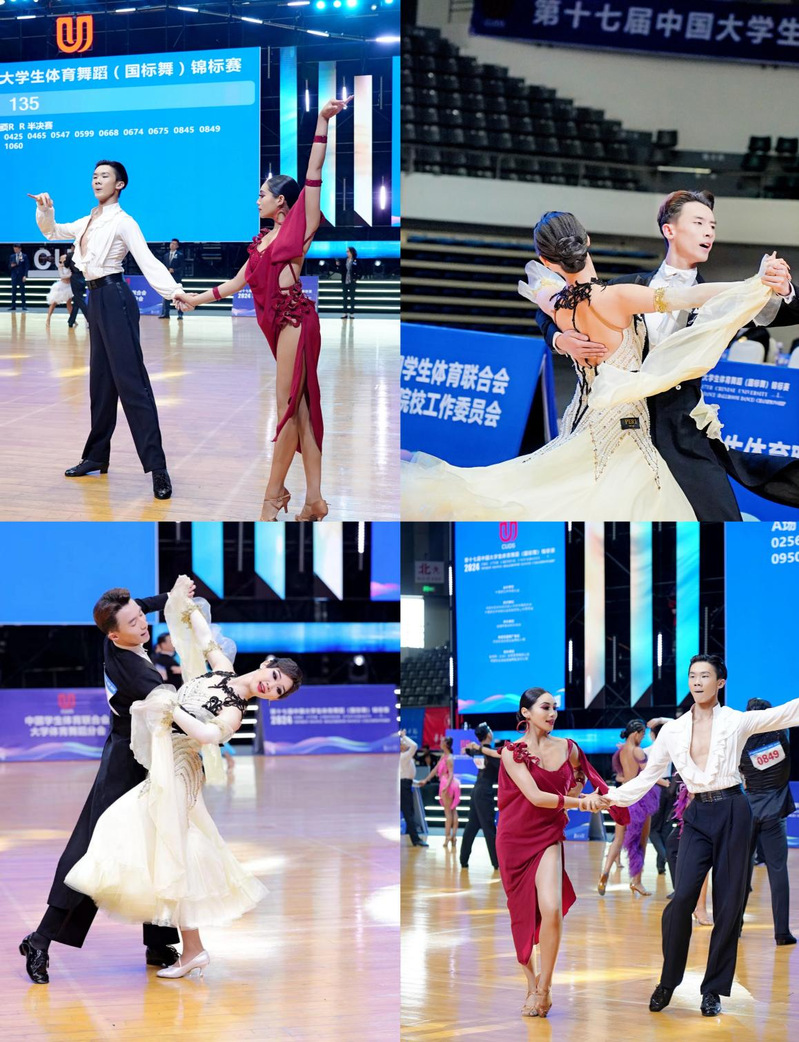 2024年5月30日下午4时,第十七届中国大学生体育舞蹈(国标舞)锦标赛在四川省绵阳市九洲体育馆落下帷幕。舞蹈学院在党总支副书记徐芳、特聘院长戴虎,史傲、鲍冠兰及常小龙三位教师的带领下,派出2对选手参赛。经过激烈角逐,舞蹈学院2023级孙龙宇、2021级曹诗雯同学在大学丙c组(专业组最高组别)中,斩获六项全能组季军(第三名)。