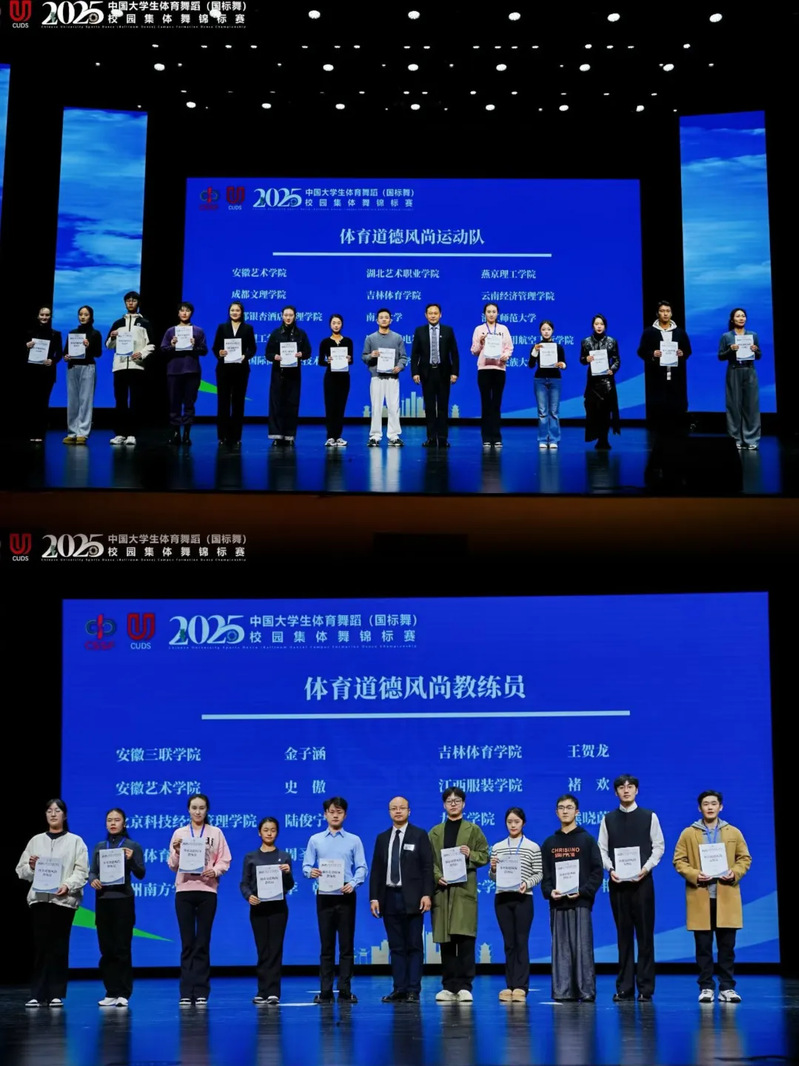 比赛中,我院参赛学子发挥稳定,原创作品《墨还乡》获国标舞艺术表演舞丙C组(最高组别)一等奖,《搏鼓唤山》获国标舞校园竞技自编舞丙C组(最高组别)一等奖。同时,学院获体育道德风尚团队,史傲老师获评体育道德风尚教练员,4名学生获体育道德风尚运动员奖项,这是安徽首次在该赛事中获得此类荣誉。