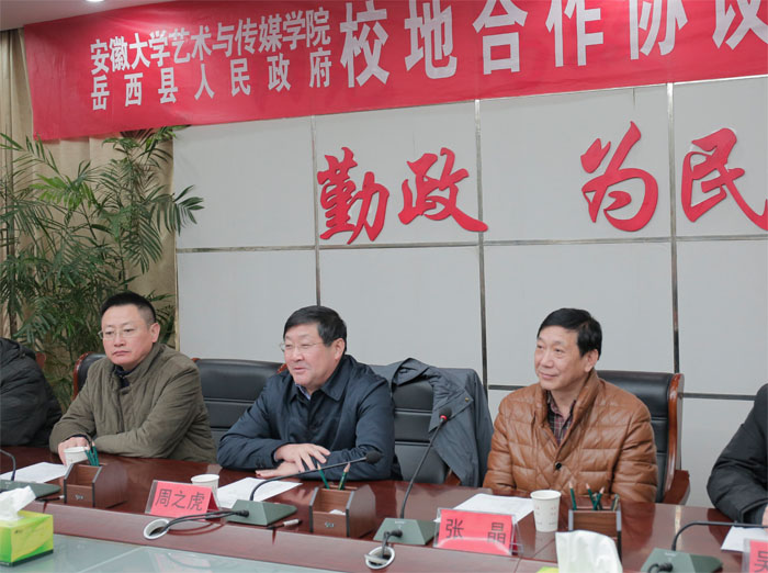 仪式上,江春生介绍了岳西县情,周之虎介绍了安徽大学艺术与传媒学院组建情况。双方就如何做好产学研政合作进行充分探讨,并签订了合作协议。