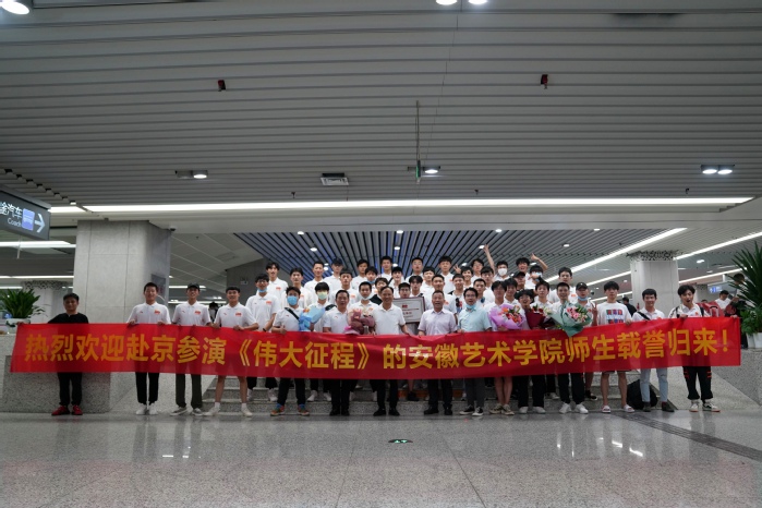 《伟大征程》由中共中央宣传部、文化和旅游部、国家广播电视总局、中央广播电视总台、中央军委政治工作部、北京市等单位主办。在这场盛大的演出中,我校派出43名师生参加。经过近百天全封闭的艰苦排练,我校师生圆满完成了其中4个节目的演出任务及电影《伟大征程》拍摄任务。参演师生本着高度的责任心、使命感,坚定的信心,严明的组织纪律,以顽强的意志克服重重困难,精益求精,展示了博业体育(中国)官方网站-登录入口风采,得到了北京导演组的一致好评。7月4日,校领导周明洁、樊嘉禄及系部负责人一行专程前往合肥南站迎接赴京演出师生凯旋归来。