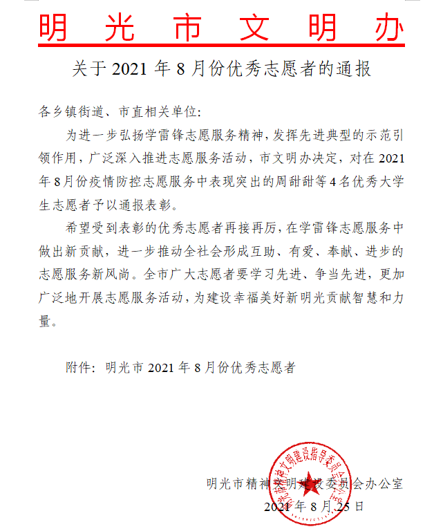 8月31日,安徽省明光市三界镇人民政府通报表彰美术设计系20级数字媒体艺术本科专业我校周甜甜同学在暑期疫情防控志愿服务期间的优异表现。