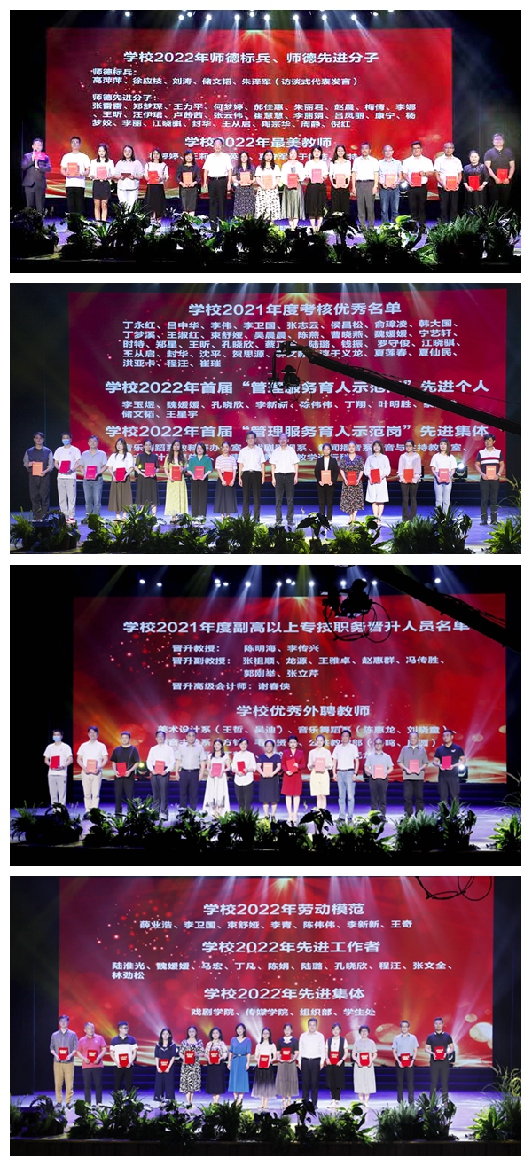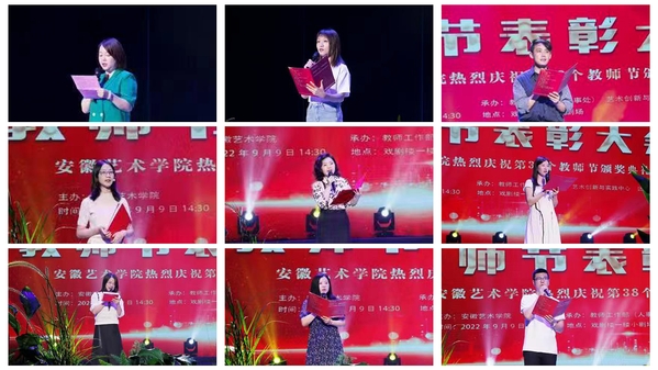 表彰活动中,参会人员还共同欣赏了音乐学院选送的合唱《飞来的花瓣》和歌曲《我的深情为你守候》,戏剧学院选送的情景朗诵《致老师的一封信》,传媒学院选送的诗朗诵《诗颂风华》及师德标兵们共同献上的情景讲述《光阴的故事》。